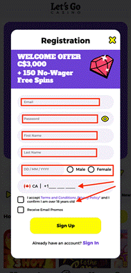 - Enter personal information, including full legal name, date of birth (19+ in most provinces, 18+ in Alberta, Quebec, and Manitoba), email, phone number, and address.